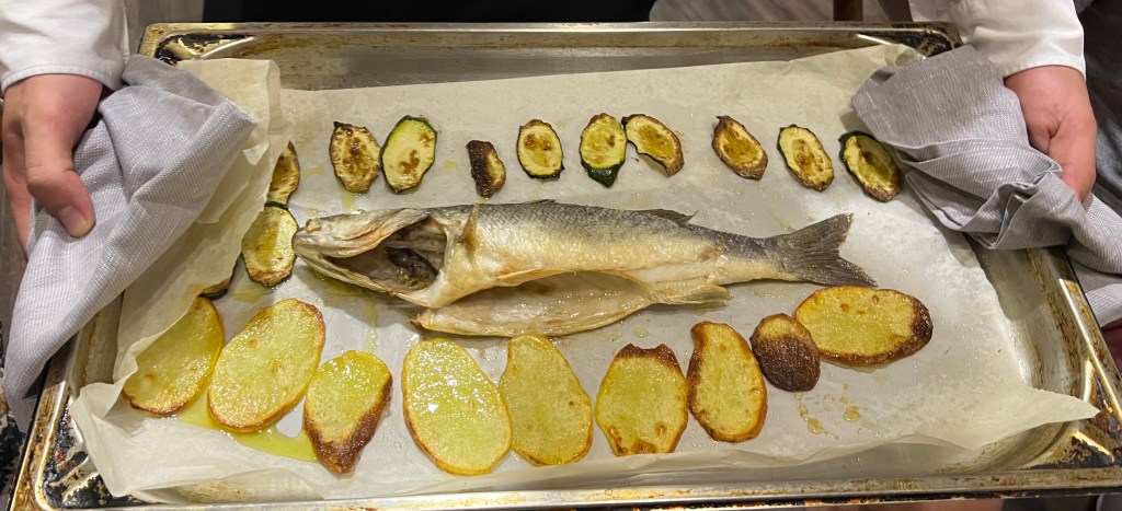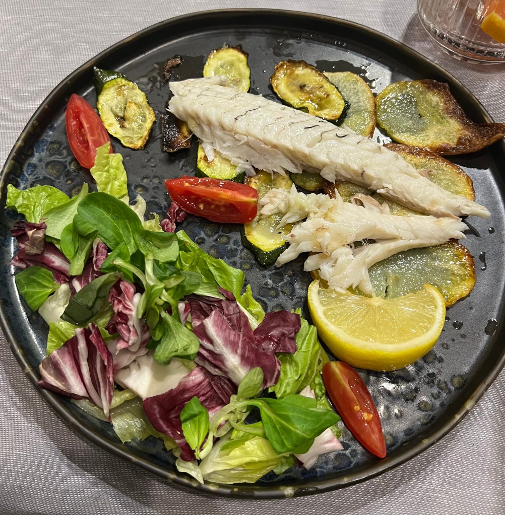 FILETTI DI SPIGOLA PROFUMATA AL LIMONE SU CUBETTATA DI CALAMARI E ZUCCHINE sea bass fillet scented with lemon and cubed squid and zucchine