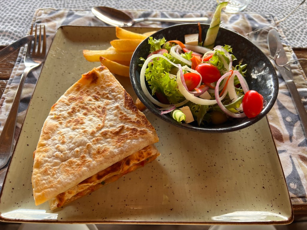 THE CHOBE QUESADILLA, seared diced chicken breast sautéed in capsicum, garlic and onion and fished with crated cheddar cheese. Served with handout French fries and a side sala (sic)