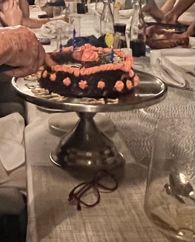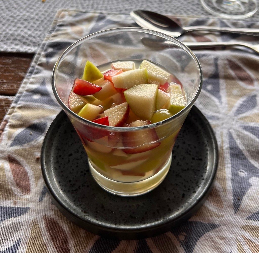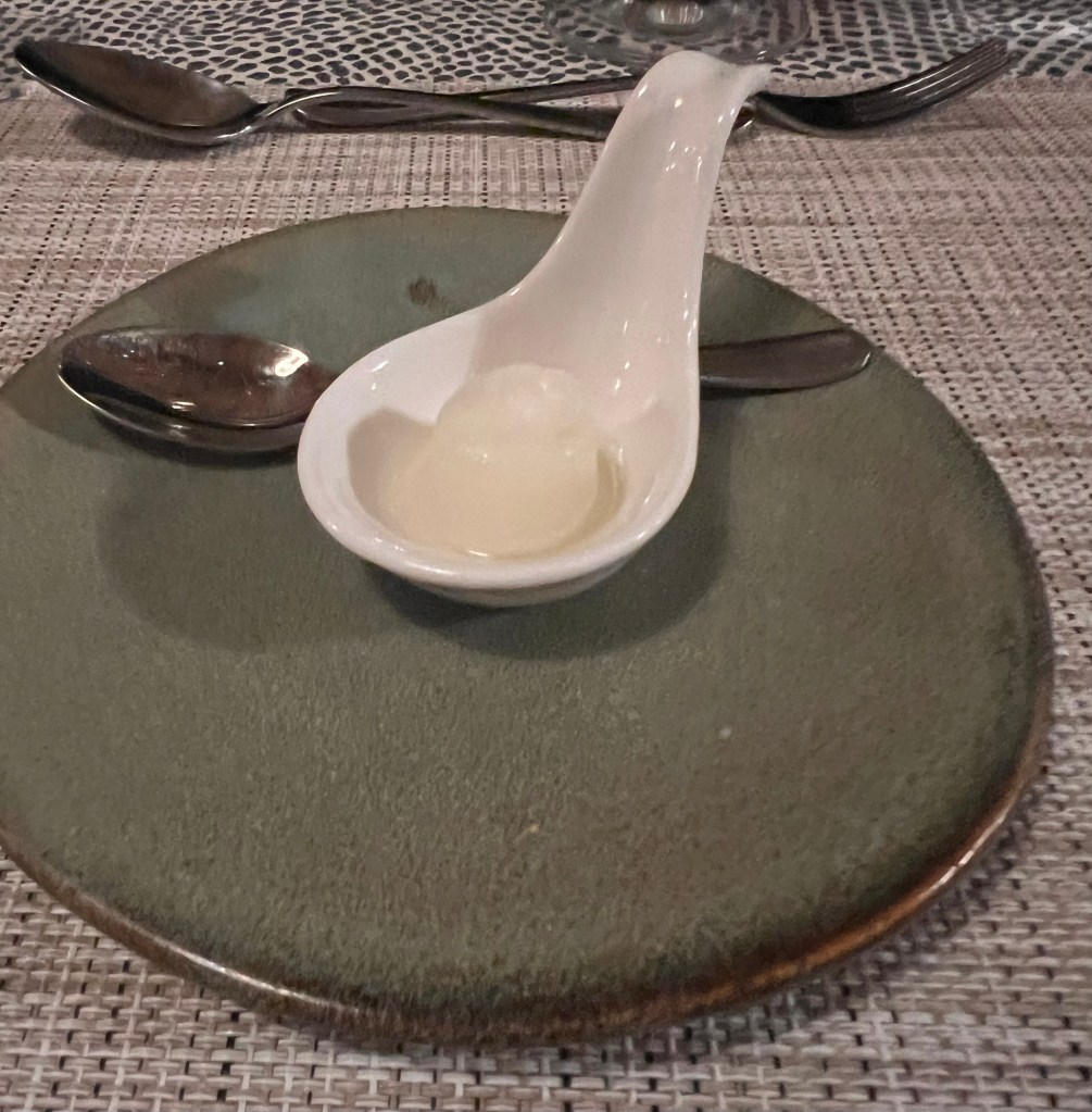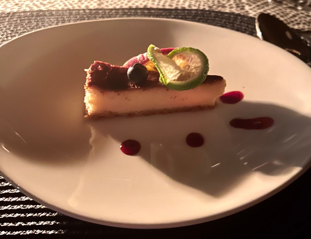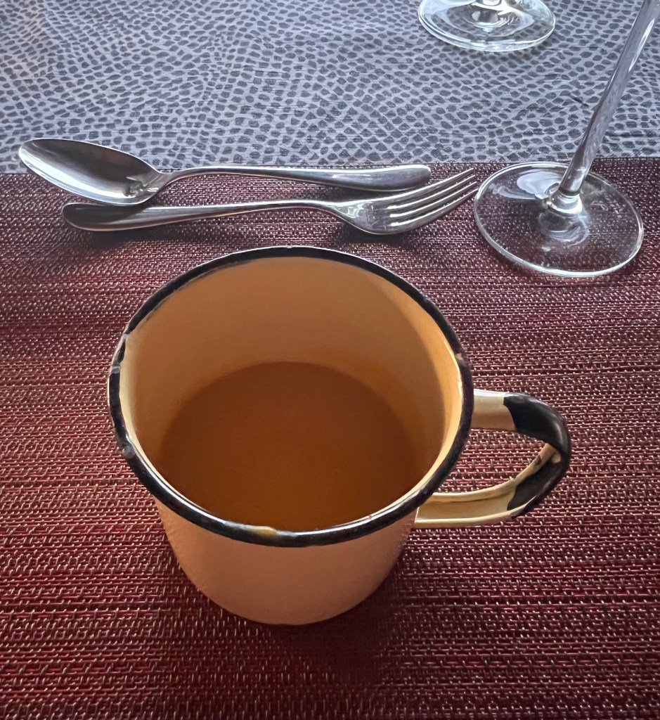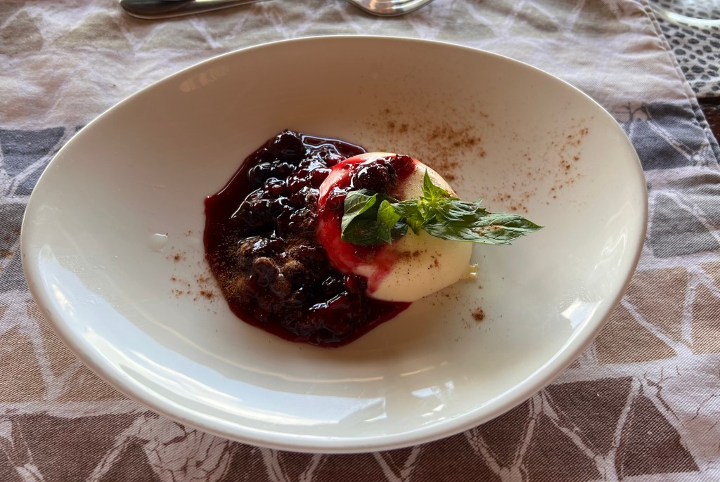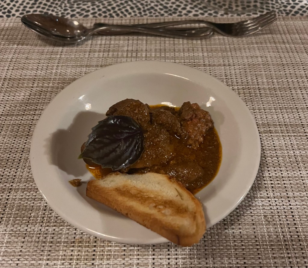 LE TSOGILE JAANG “GOOD MORNING’ two fried eggs sunny side up alongside a champagne grilled pork sausage, chicken liver and bacon skewer sautéed potatoes and finished with basil pesto