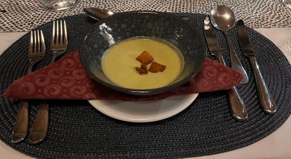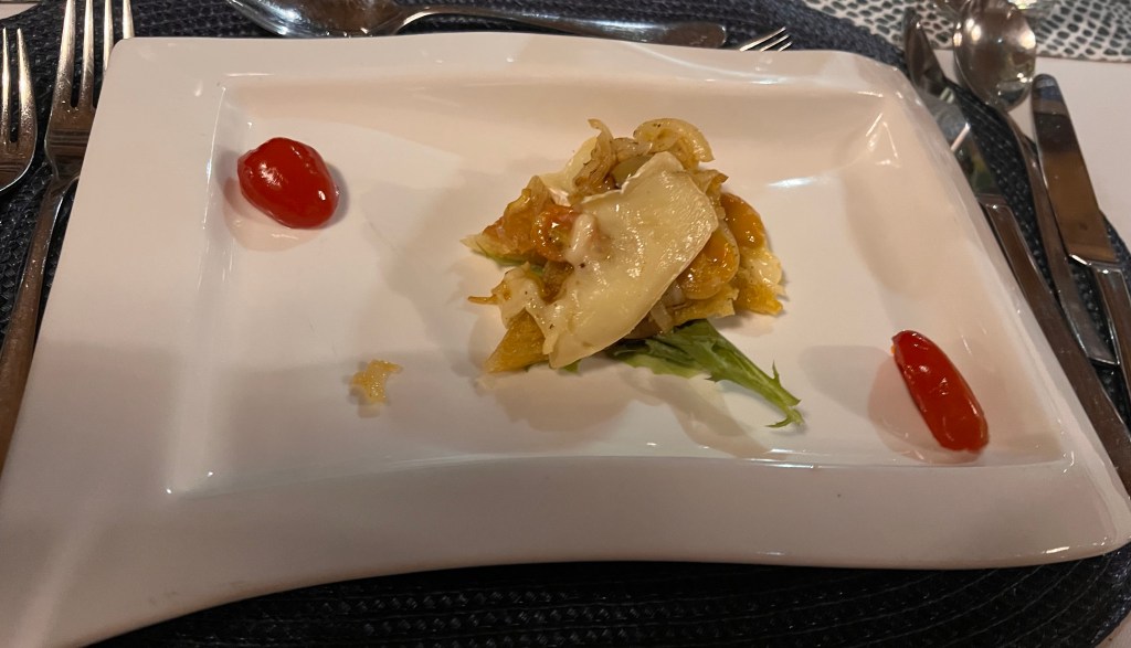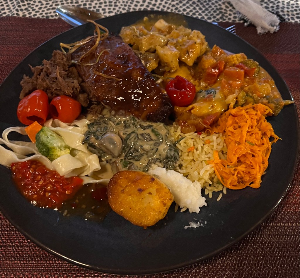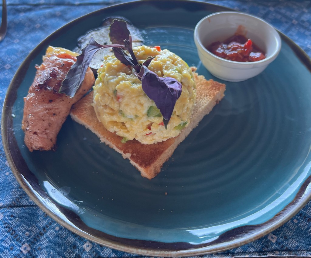 BELL PEPPER AND ONION SCRAMBLED EGG sautéed bell pepper and onion mixed with fresh herbed scrambled eggs, potatoes wrapped with bacon, grilled aubergine and complimented with handpicked finest Chobe chillies