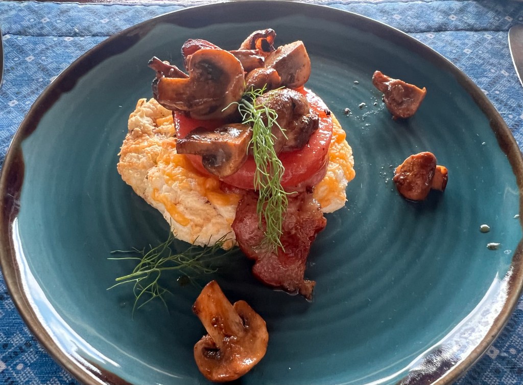 SAMMY’S NAOMA BREAKFAST STACK, whipped fluffy cinnamon and roasted crushed sesame seeds egg white topped with cheddar cheese, crispy bacon, herbed grilled tomato and garlic sautéed button mushrooms dried with chopped herb pesto