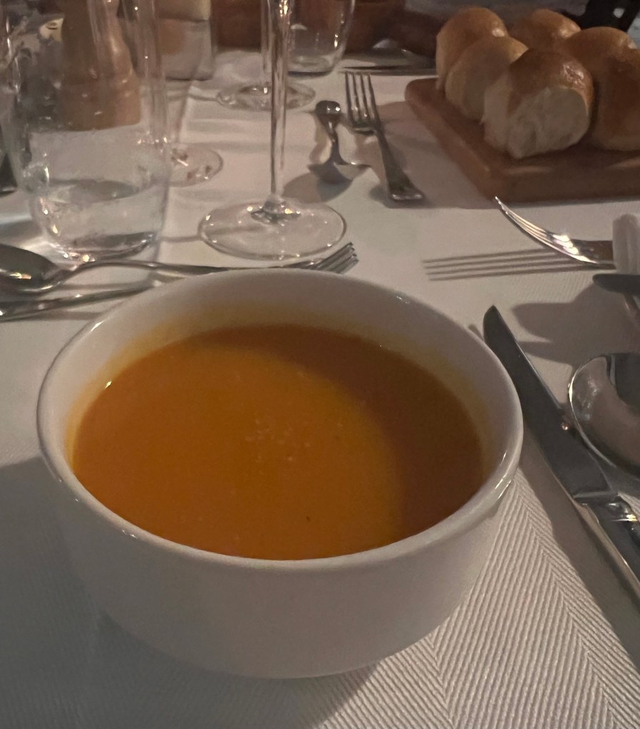 CARROT AND BUTTERNUT SOUP with same croutons and crumbled feta