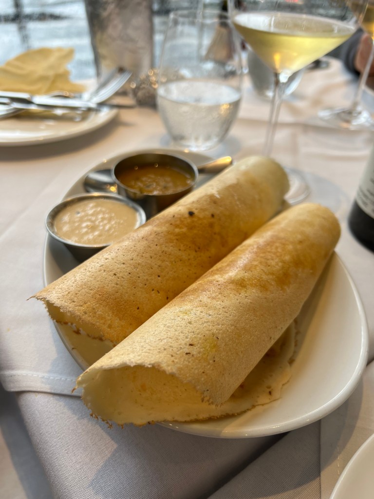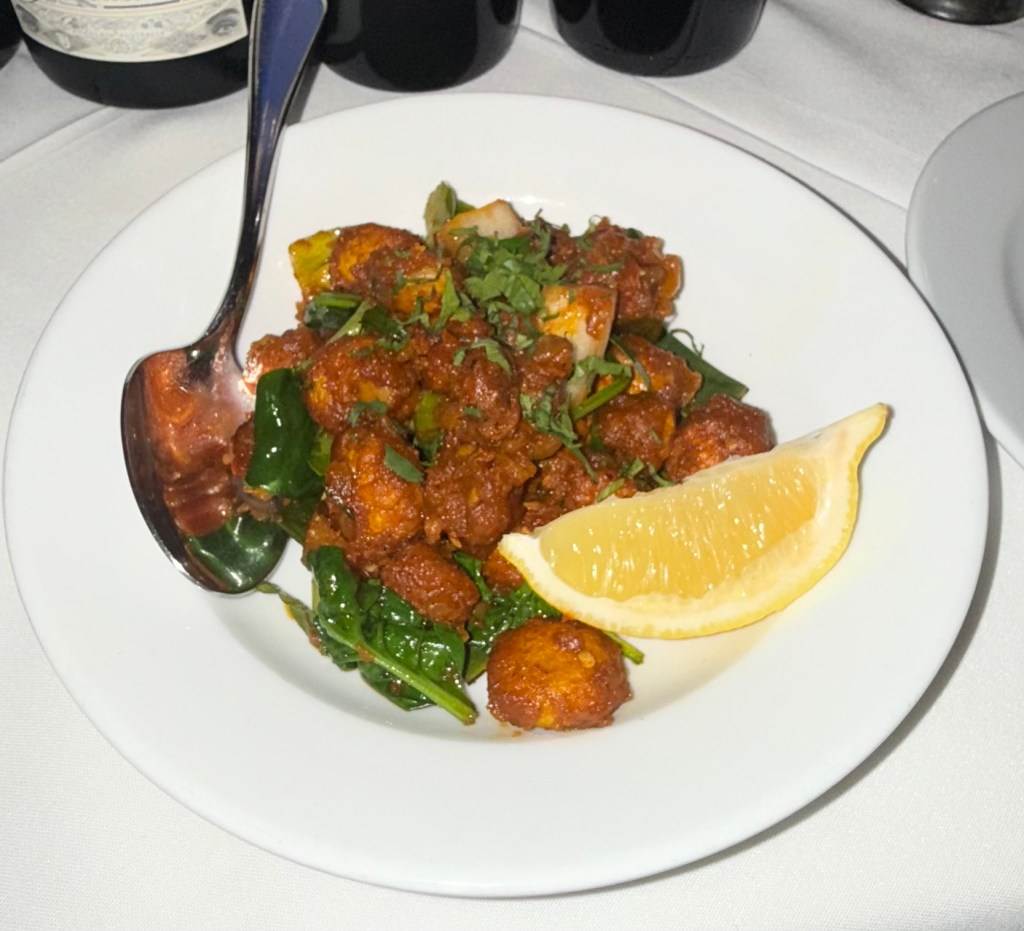 CHILLI GARLIC MUSHROOMS button mushrooms coated in a spiced chickpea batter with roasted cumin, garlic and a dusting of red chilli powder. Finished with speckles of cheese and fresh spinach, celebrating the spirited street-food flavours of South India