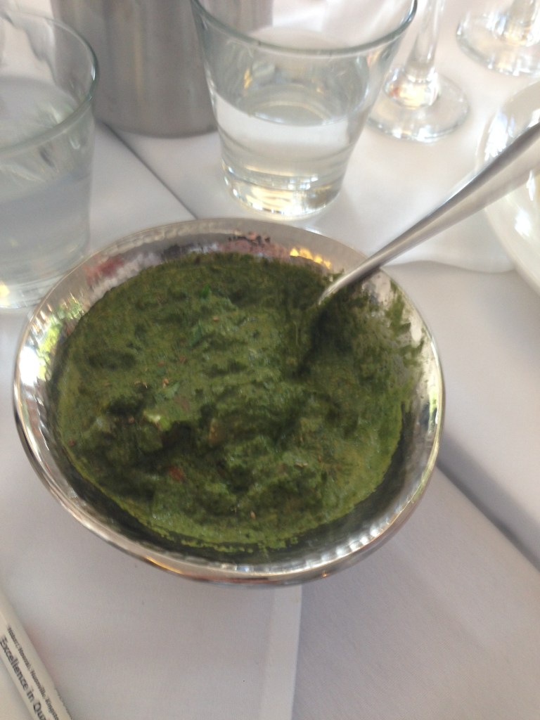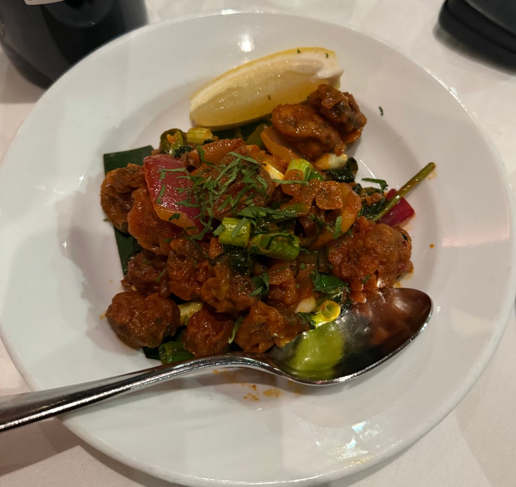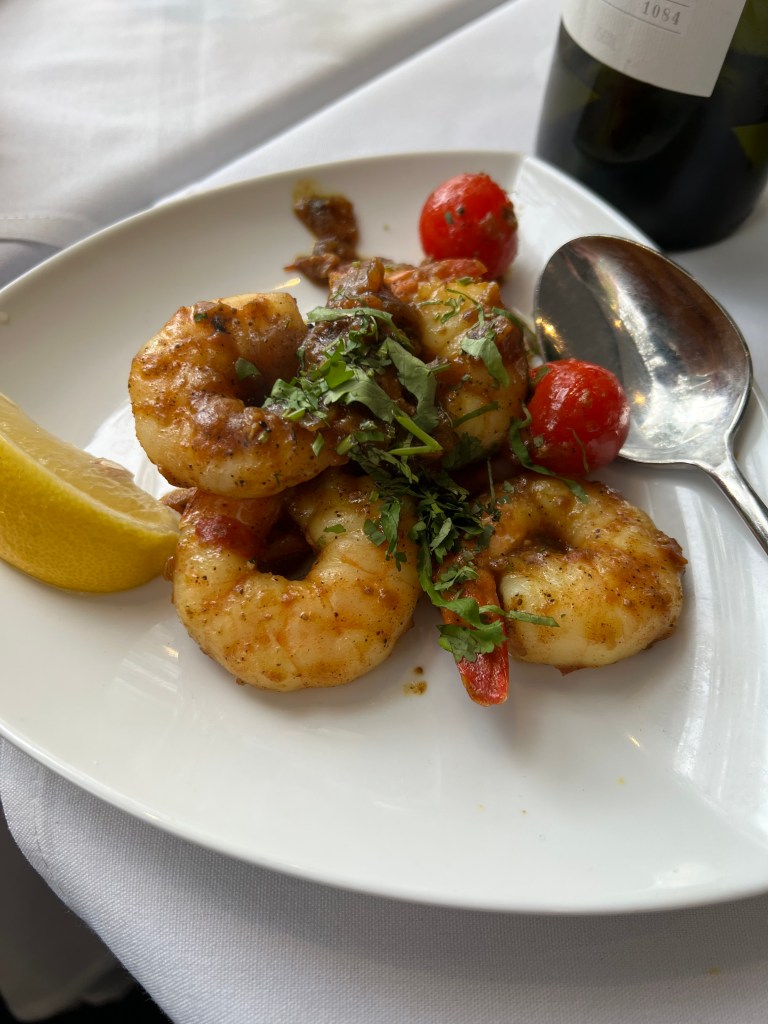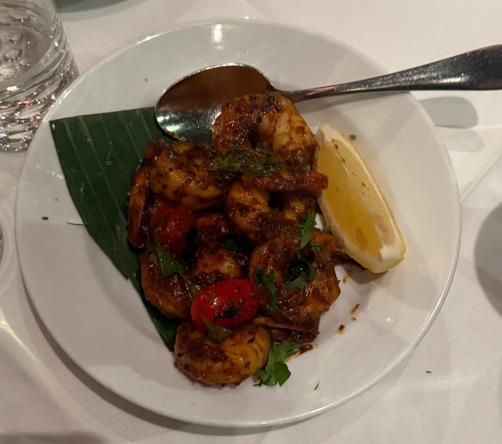 MALLAGU PRAWNS tiger prawns tossed in crushed Malabar peppercorns, red onion, tomato relish and fennel seeds