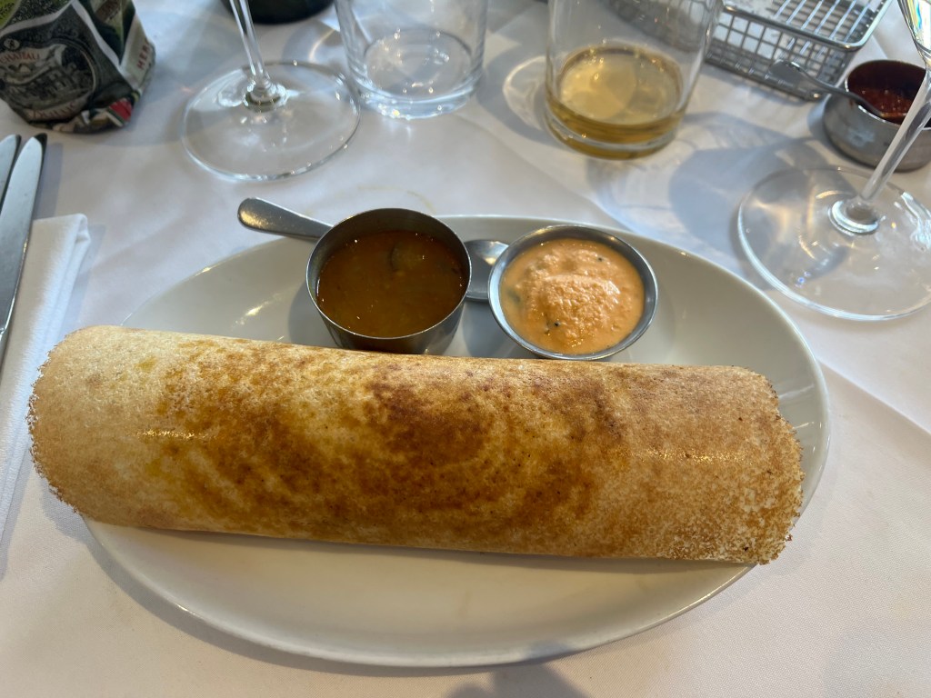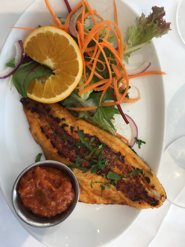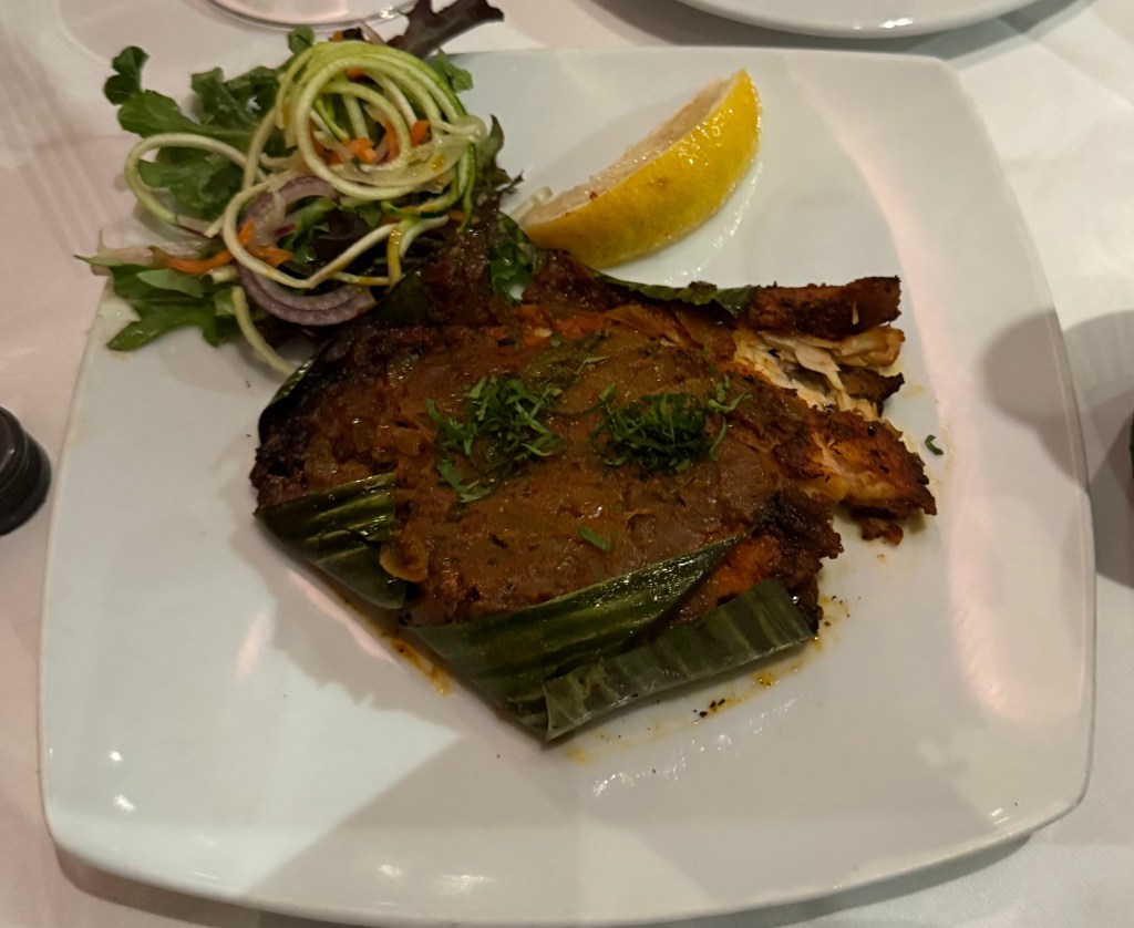 BANANA LEAF GRILLED BARRAMUNDI (known as mean Pollichathu in Kerala) “marinated in ginger, garlic and a touch of green chillies, wrapped in a fragrant banana leaf with caramelised onions and ripe tomatoes. Gently spiced with turmeric and chilled powder, then grilled to perfection, capturing the vibrant coastal flavours of Kerala”