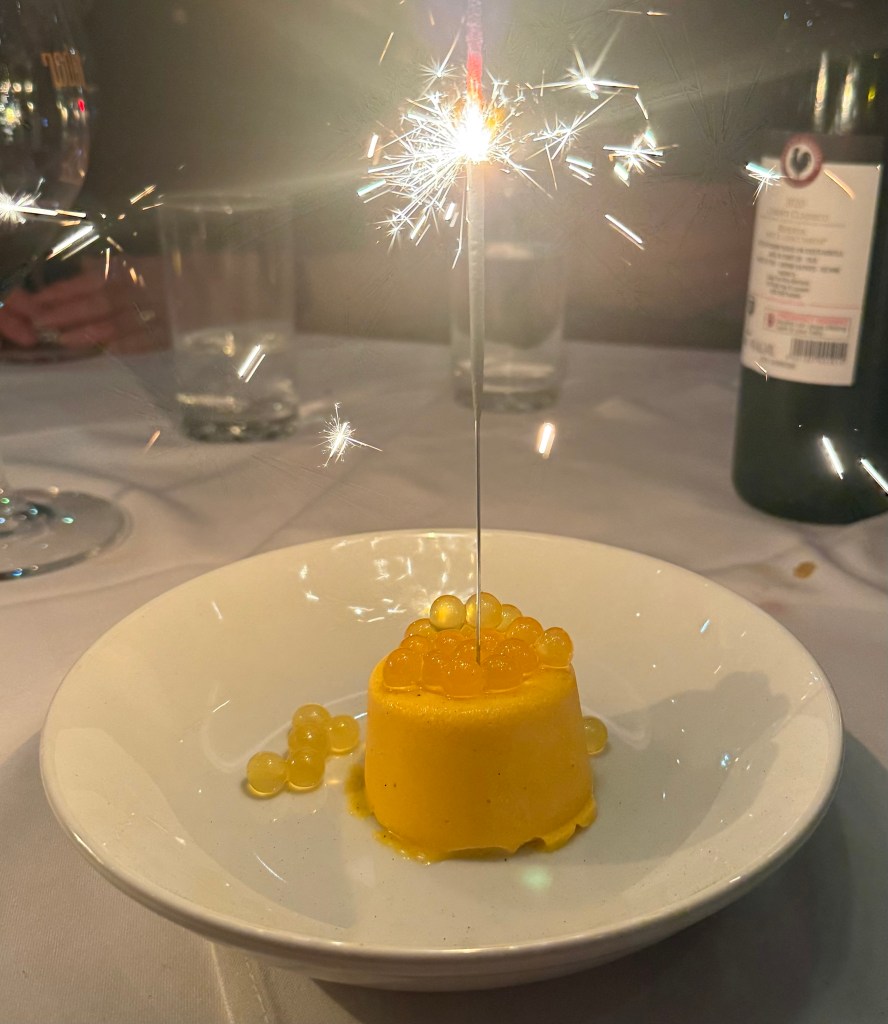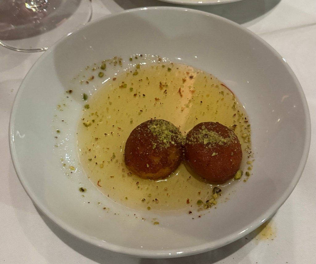 GULAB JAMUN two golden sticky milk dumplings wrapped around a pistachio soaked in rose and cardamon infused sugar syrup