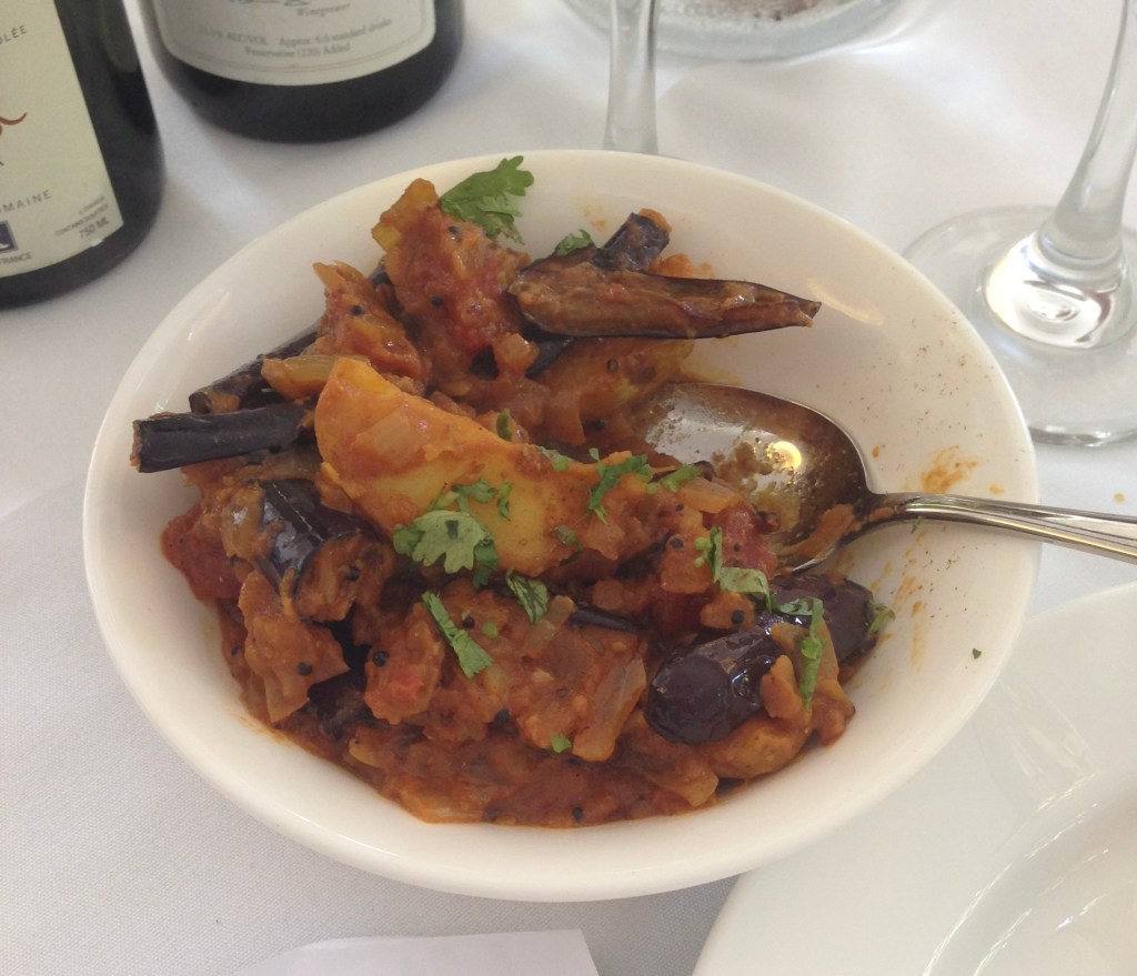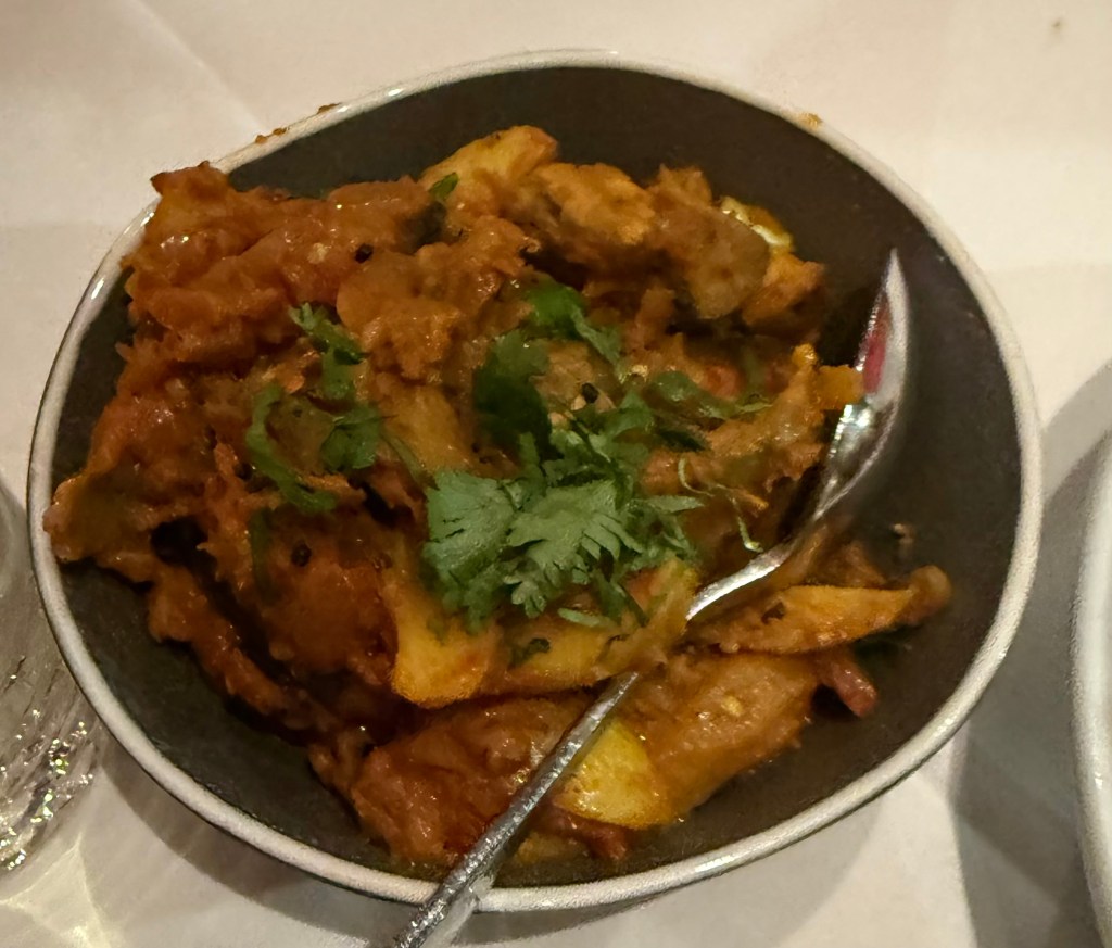 BABY EGGPLANT & POTATO “eggplant wedges are delicately mixed with a generous sprinkle of panch phoran, creamy natural yoghurt, hearty onions, chat potatoes, resulting in a semi-dry finish”