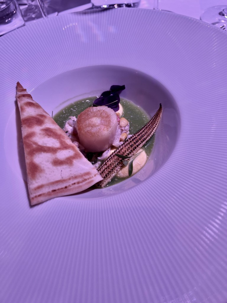 SEARED SCALLOP, SCALLOP CEVICHE, CORN PUREE, CORN SALSA, FRIED TORTILLA, JALAPENO GAZPACHO