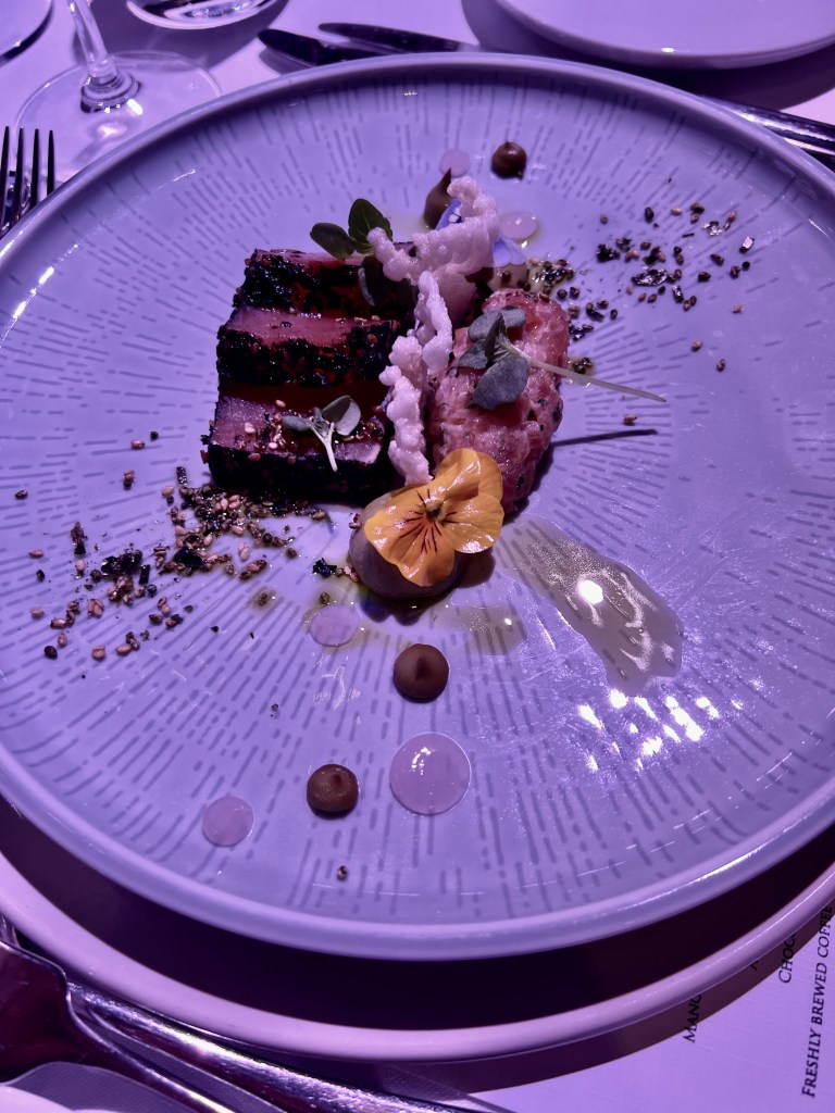 SESAME AND NORI CRUSTED TUNA, POACHED PRAWN, YUZU CURED TUNA TARTARE, AVOCADO PUREE, FURIKAKE, SUSHI RICE PUFF, PICKLED GINGER GEL