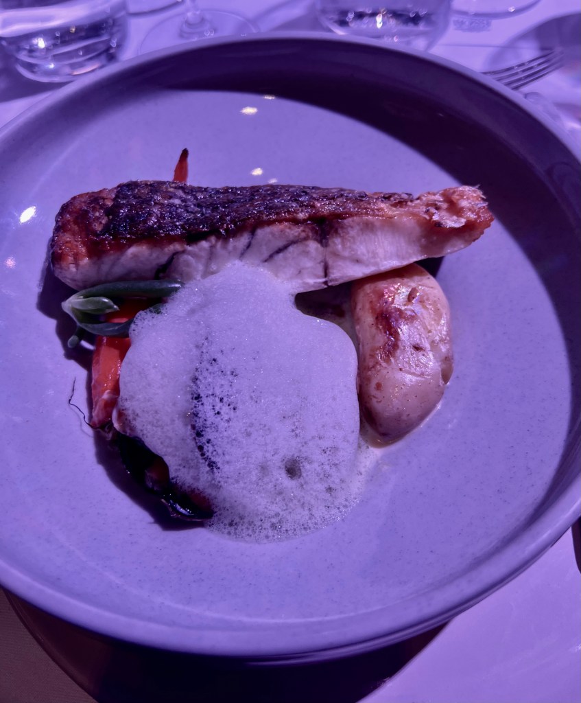 CRISPY SKIN BARRAMUNDI, SHELLFISH REDUCTION, BABY CARROT, KIPLER POTATO, MUSSELS, KARKALLA (pig face), DILL FOAM