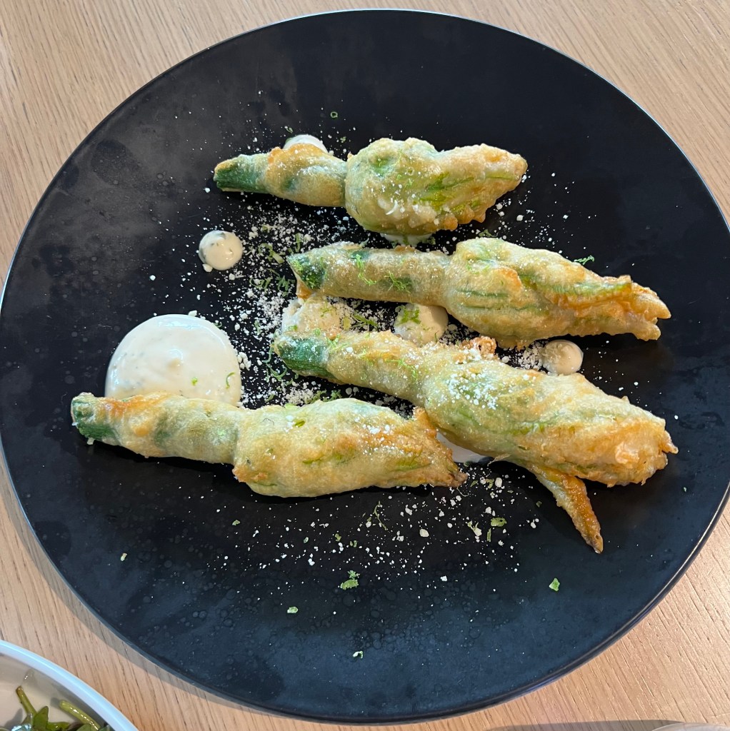 FIORI DI ZUCCHINE Crisp zucchini flowers, meredith goat’s cheese, green olives, citrus, lemon aioli, grana padano