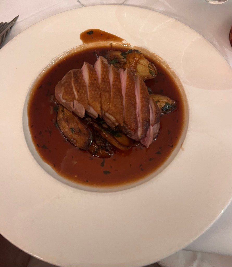 PAN RENDERED FILLET OF DUCK BREAST w peaches, eschallots & Armagnac jus