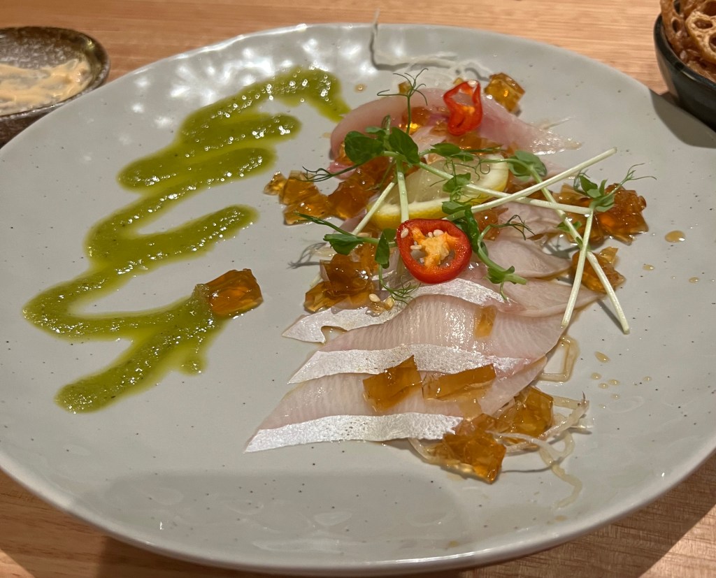 KING FISH CARPACCIO served with ponzu sauce, daikon, sliced chilli, herbs