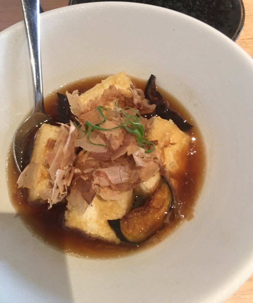 NASU AND TOFU AGEDASHI (deep-fried tofu and eggplant served with light soy sauce and bonito flake, grated radish on top)
