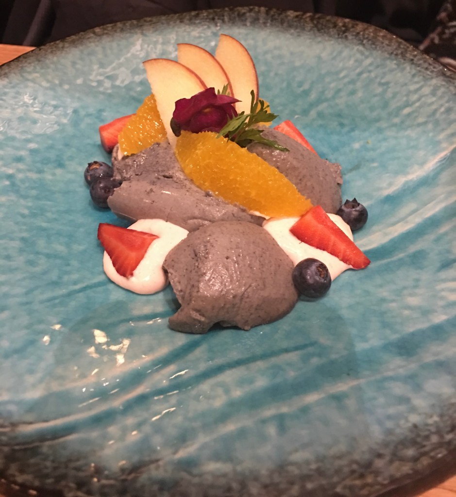 BLACK SESAME PANACOTTA served with ice cream and fruits
