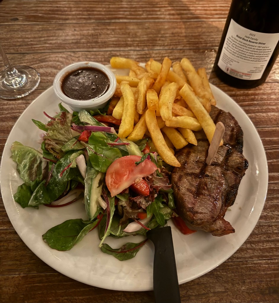 SIRLOIN MB2 (250G): cooked rare. Optional jus, chips + salad