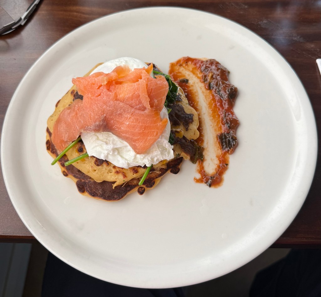 CORN & SPINACH FRITTERS smoked salmon, poached eggs + tomato relish
