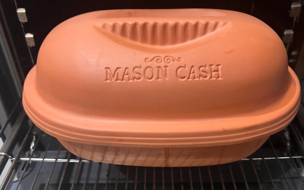 I found a Mason Cash Clay cooker unused for $20 and thinking that the makers would have tested and provided the best recipe for the pot, I cook the recipe that came with it.