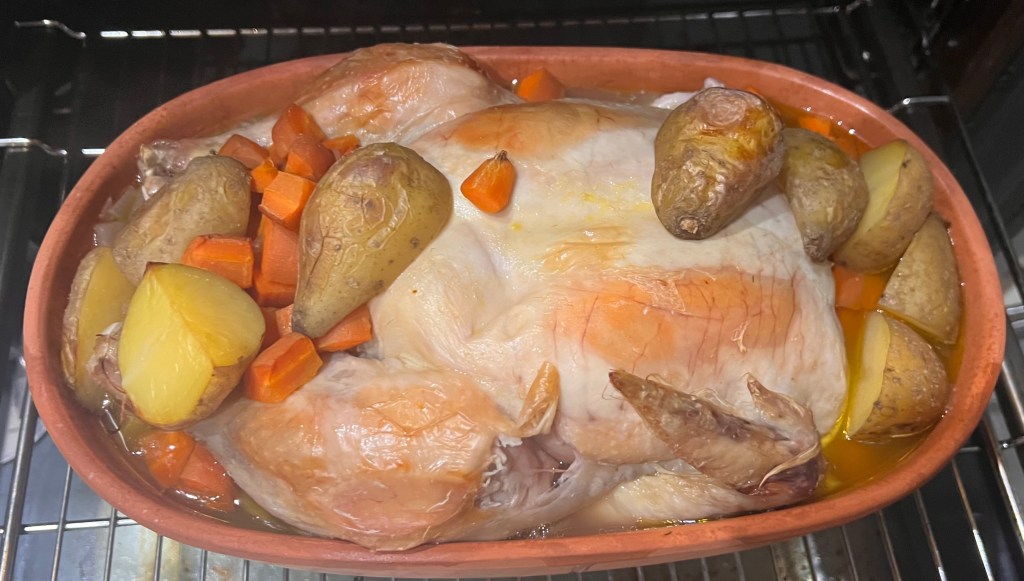 Clay pot soaked in water for some time. Organic chicken rubbed with butter and stuffed with quartered lemon and garlic. Chicken placed on a base of onion, carrots and celery, and pour over chicken stock and add some potatoes.