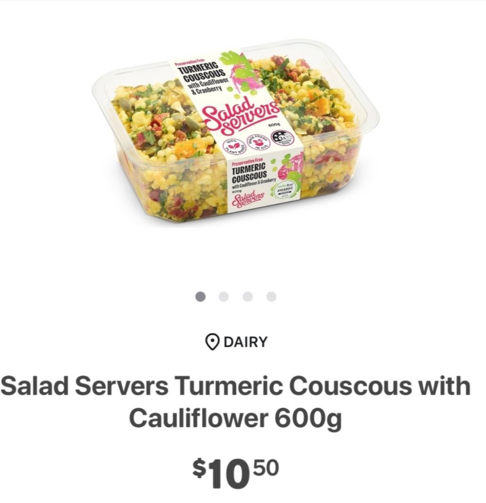 Served on a Salad of Turmeric Couscous with cauliflower, pumpkin, roasted capsicum, dried cranberries, tahini paste, roasted Pepitas, parsley and lemon juice. (Pre-made Woolworths “Salad Server” just heated.). The salad was very good.