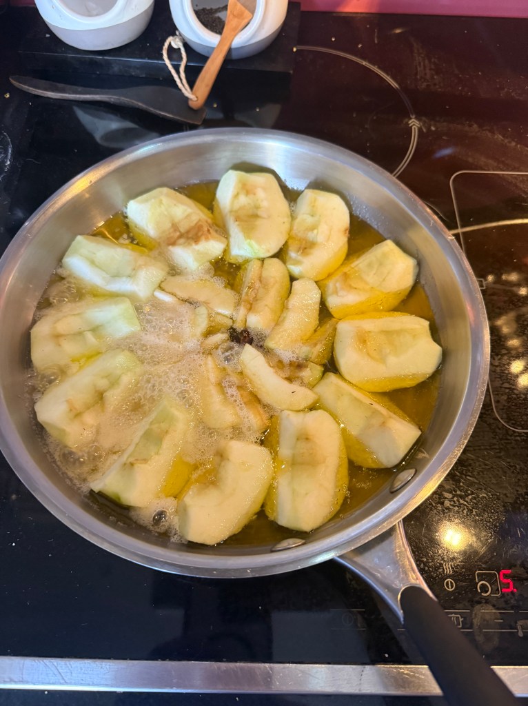 Then adding apple quarters wedge side up, and basted them in the sugar syrup (to prevent the apples oxidising).