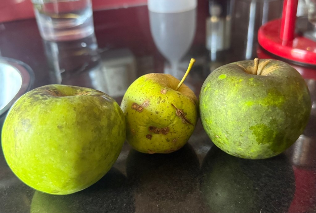SWMBO brought home a kilo or so of these apples. Other than they are home grown in the Southern Highlands and quite tarte, I am not sure what variety of apples they are. Possibly Granny Smith with a fungal disease.