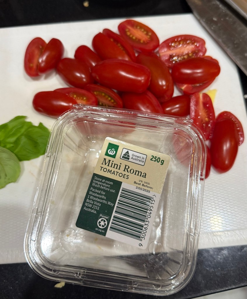 -During the pasta cooking time, a 250g punnet of mini Roma tomatoes sliced in half and fried in the garlic infused oil.