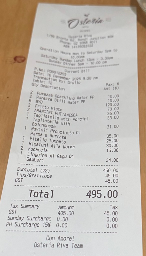 Good but not memorable food. Corkage $20 a head (even for the non drinker). They added a compulsory tip of 10% for 6 people (which we didn’t notice at the time). Final cost per head $92.33.