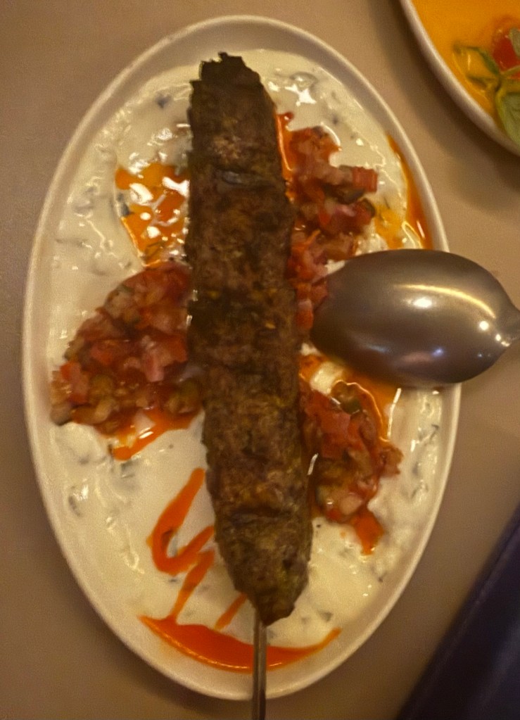 Lamb Kelab: Yogurt, Harissa, Oil, Pistachios, Chopped Salad Salsa.