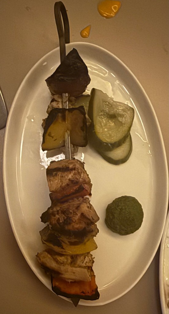 Pincho Moruno: Grilled chicken skewer, saffron-pimenton marinade, Mojo verde, Capsicum, Pickled Cucumber