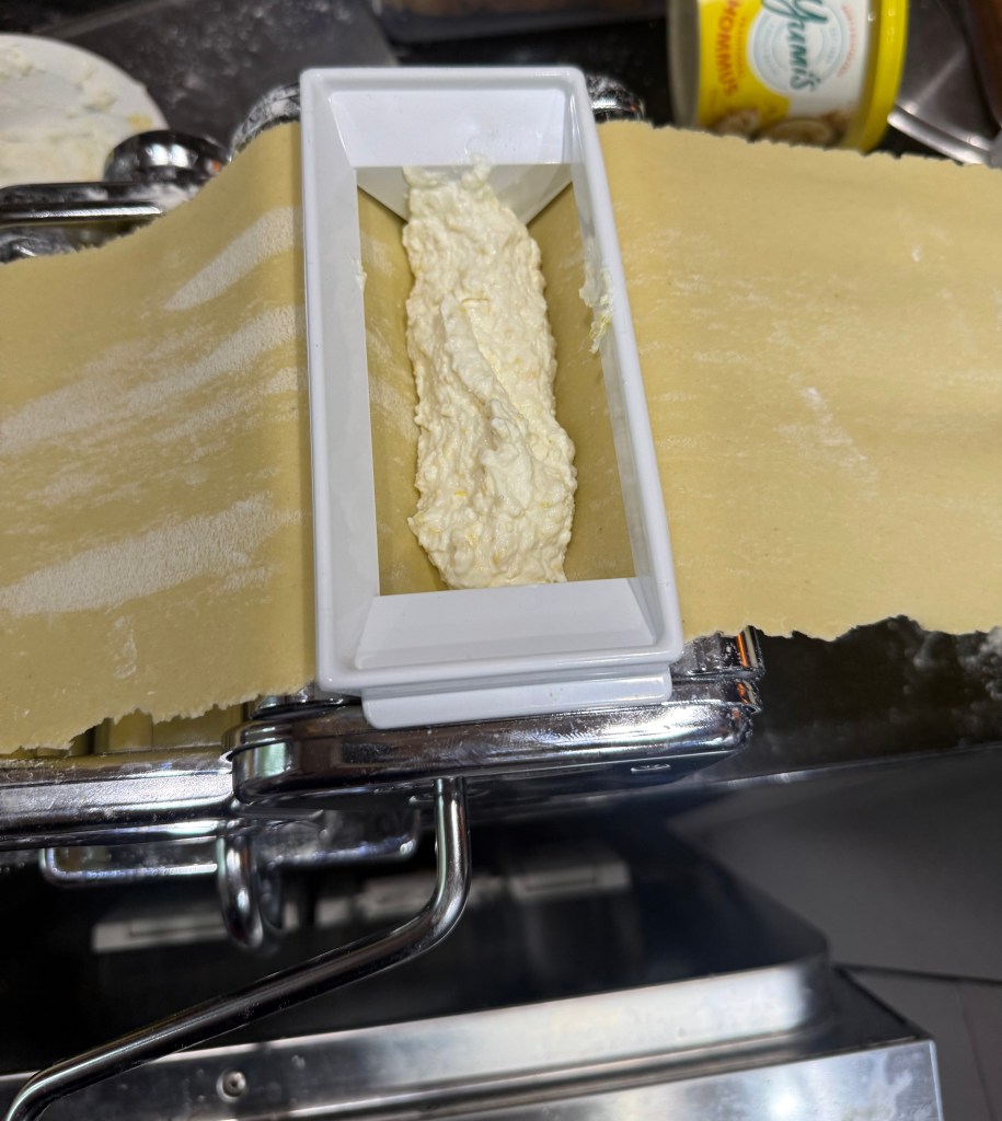 Filling: Ricotta Cheese, lemon zest, lemon juice and Parmesan. (Found the Marcato ravioli attachment at Vinnie’s!)