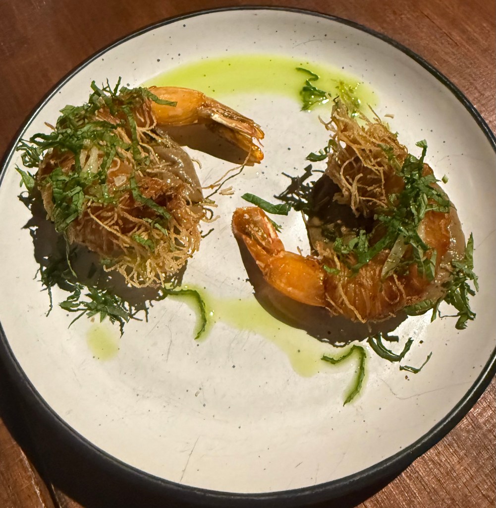 Crispy Jumbo Prawns (Black garlic, Baba Ghanoush)