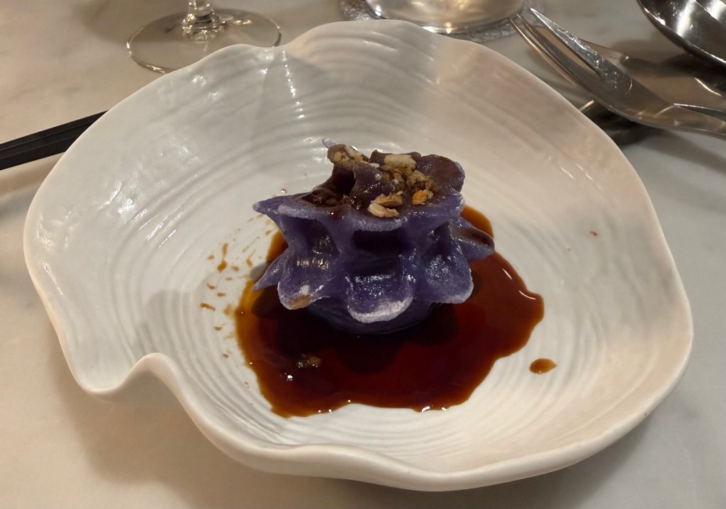 Butterfly pea dumplings, soy and vinegar dressing (the blue is natural rather than food colouring). … chicken