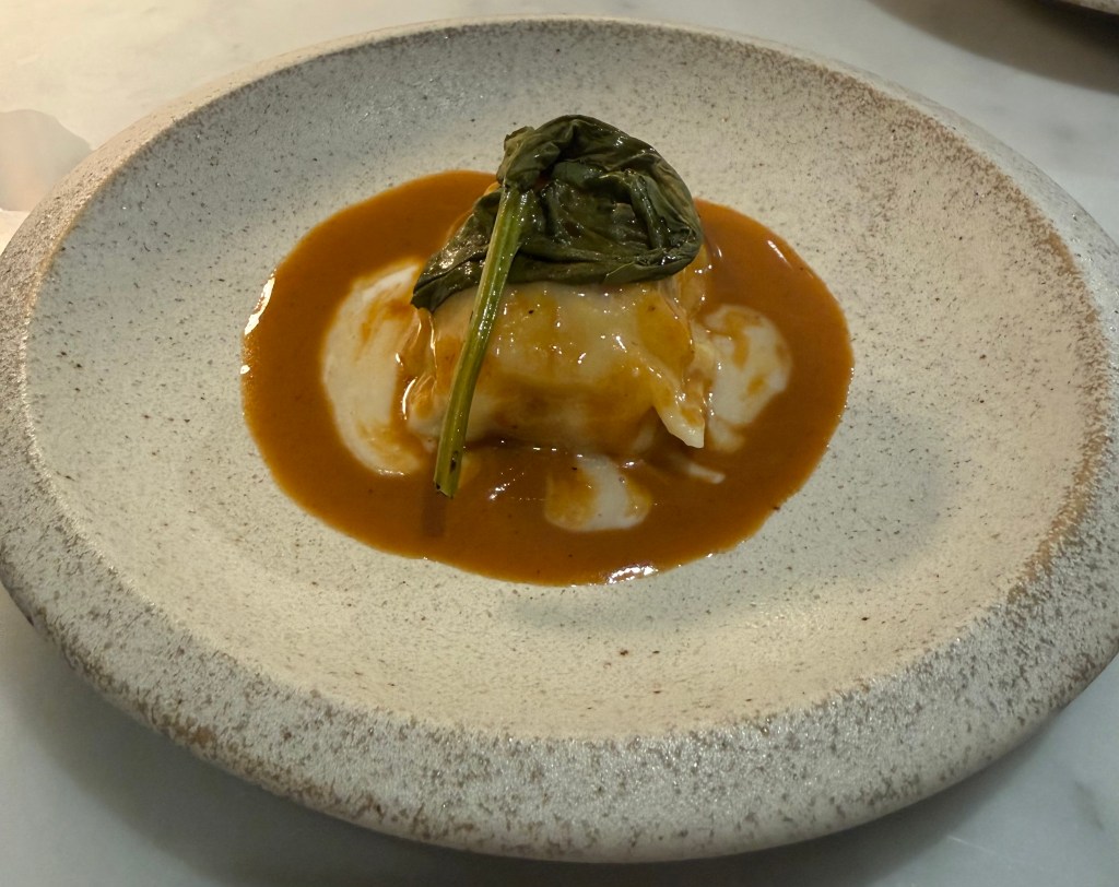 Lobster ravioli with TomYum sauce, salted coconut cream &green sorrel