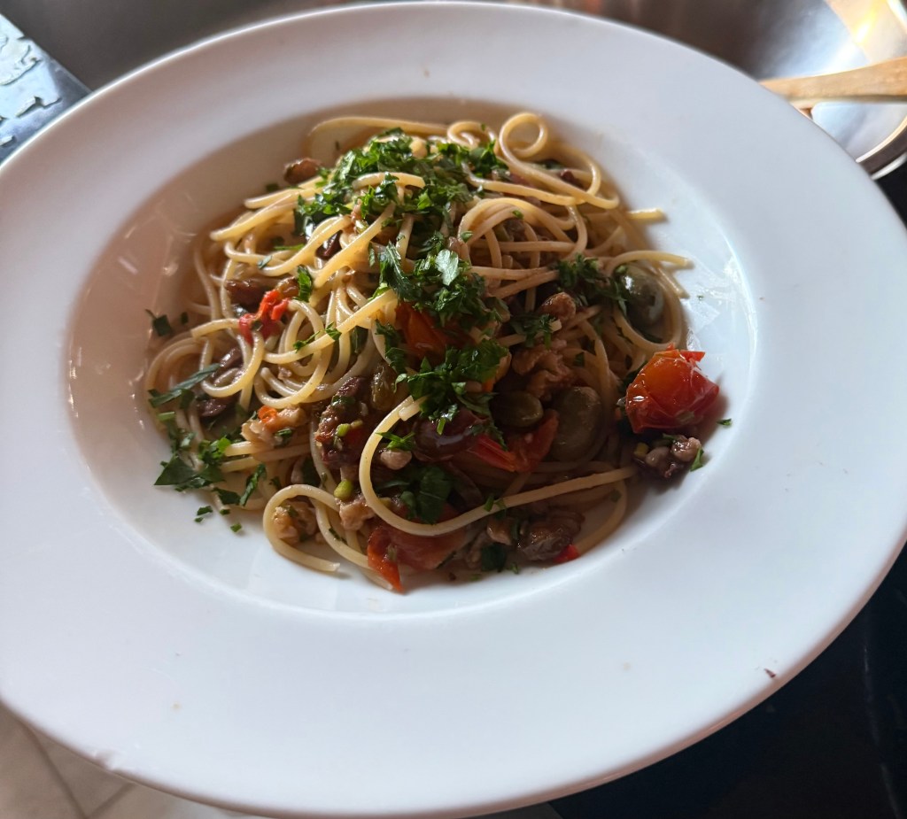 Delicious. Think Puttanesca with nuts and sultanas