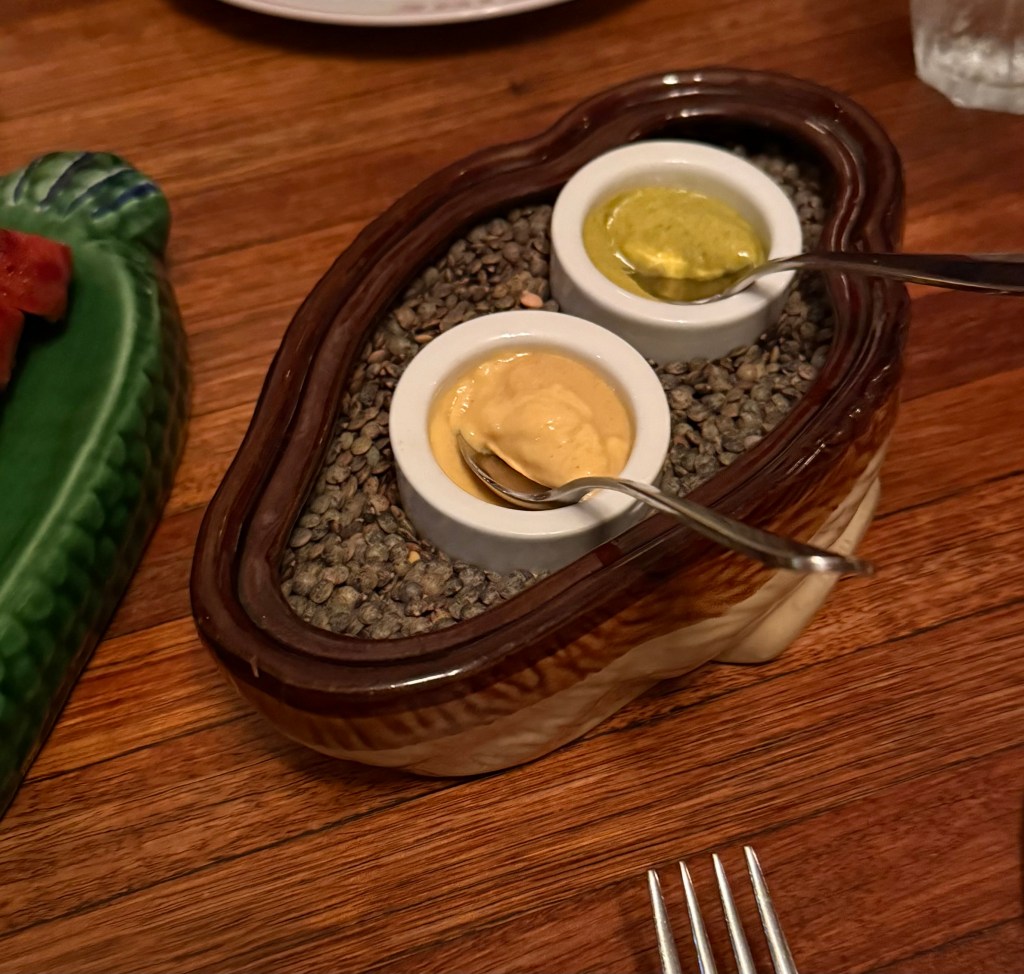 Tarragon and dijon mustards (The tarragon mustard overpowered the sausage, but you don’t need to add it)