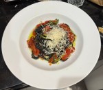 - Squid-ink pasta with poached prawns