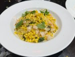 - Spaghettini, prawns, charred corn, green chilli, black garlic